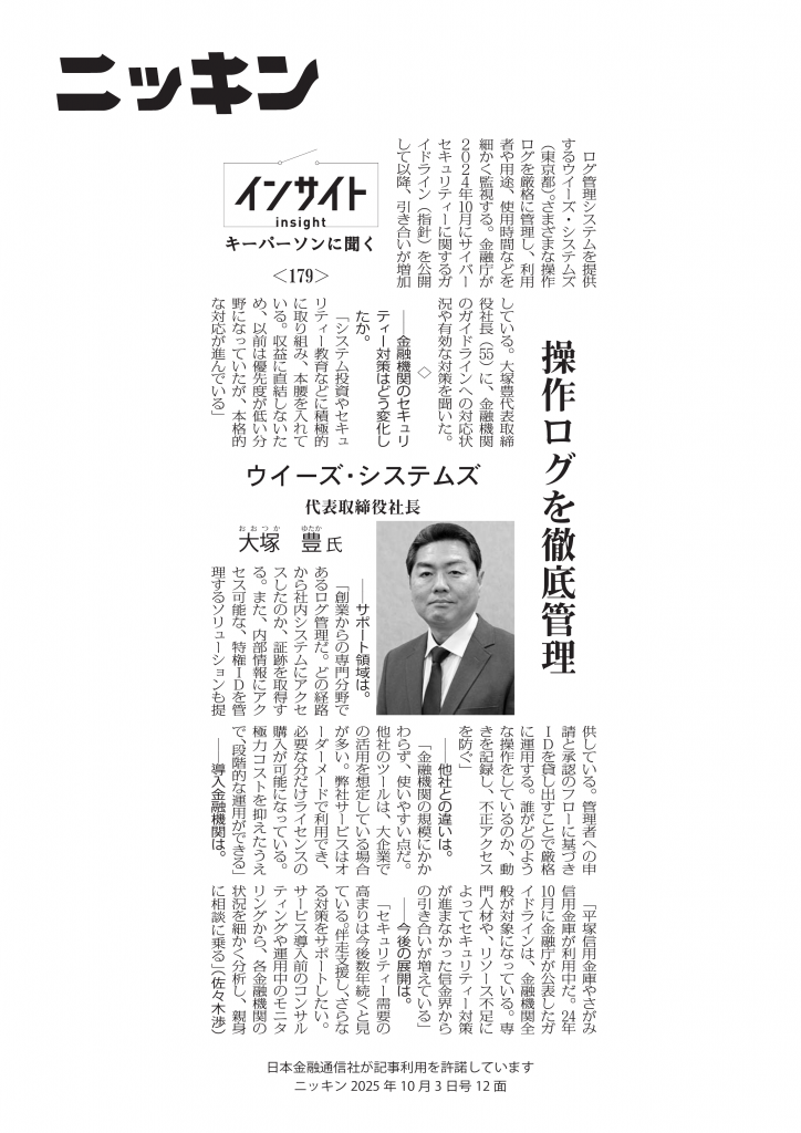 2025年10月3日発行の金融総合情報誌「ニッキン」12面に、弊社代表取締役社長 大塚豊のインタビュー記事が掲載されましたので、お知らせいたします。(二次利用の許諾を得て掲載しています)